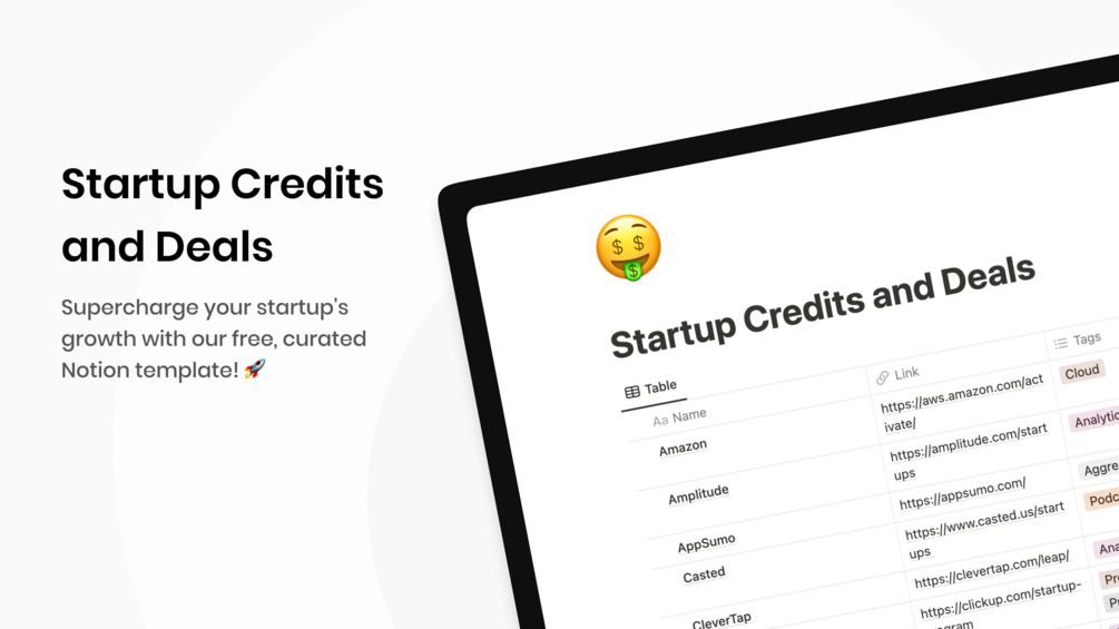 Supercharge your startup's growth with our free, curated Notion template! 🚀 It's your ultimate database to over 30 handpicked resources offering lucrative startup credits and deals.